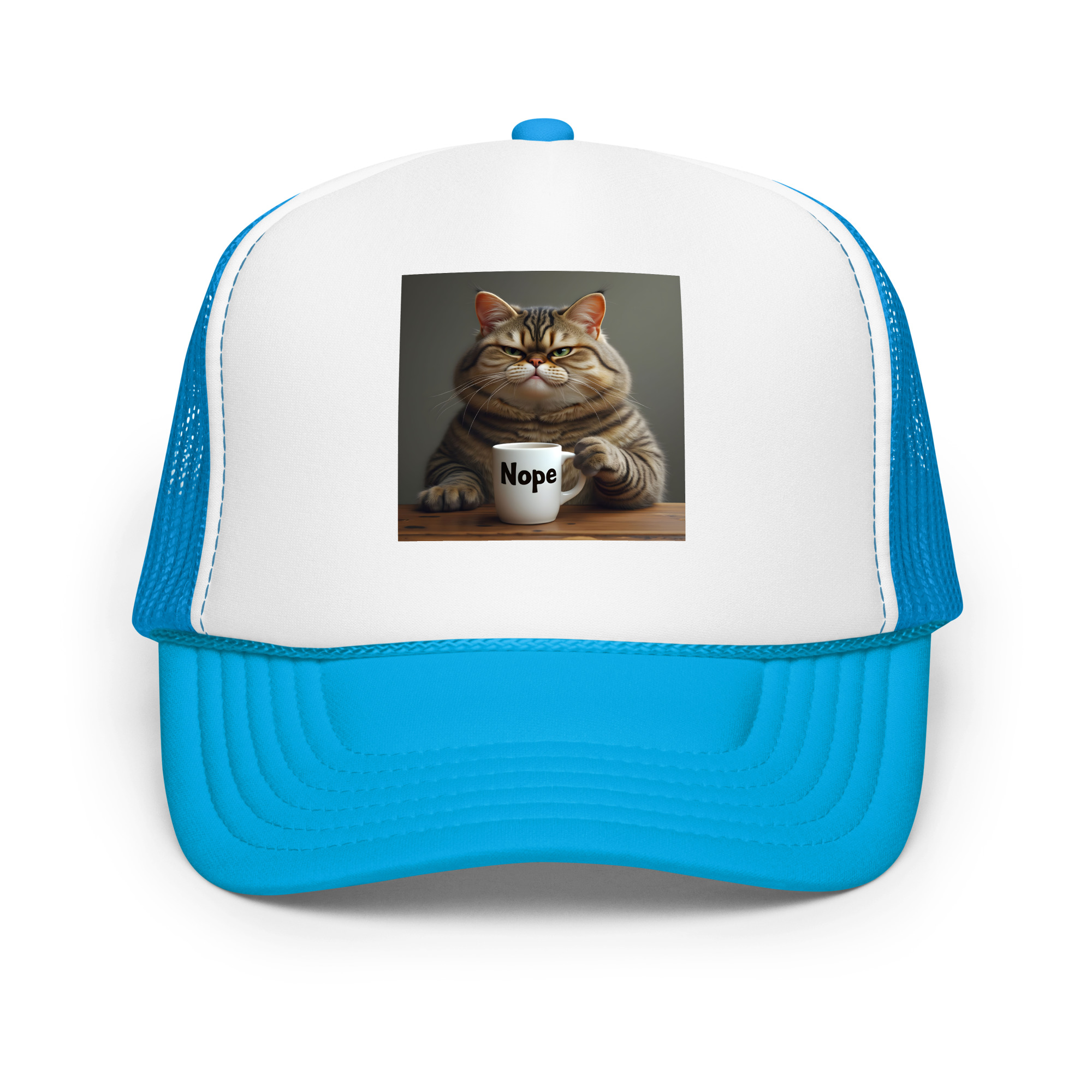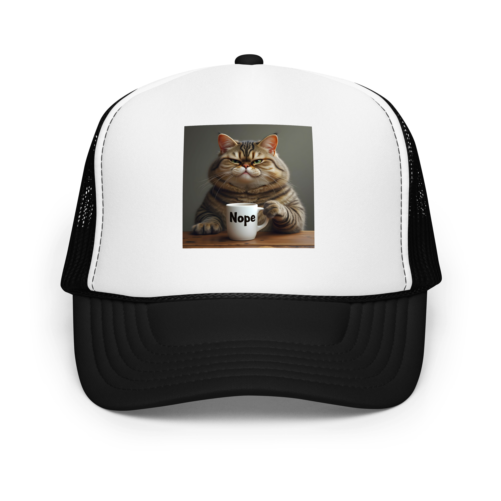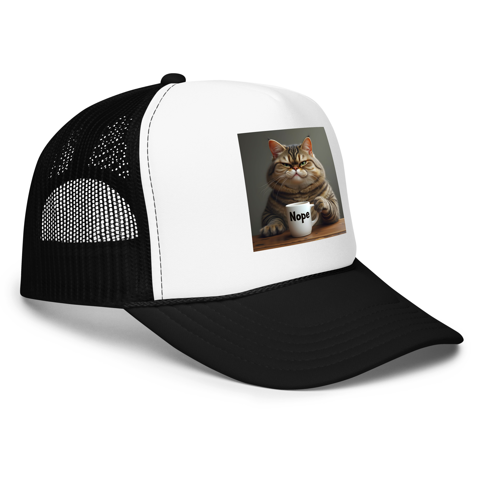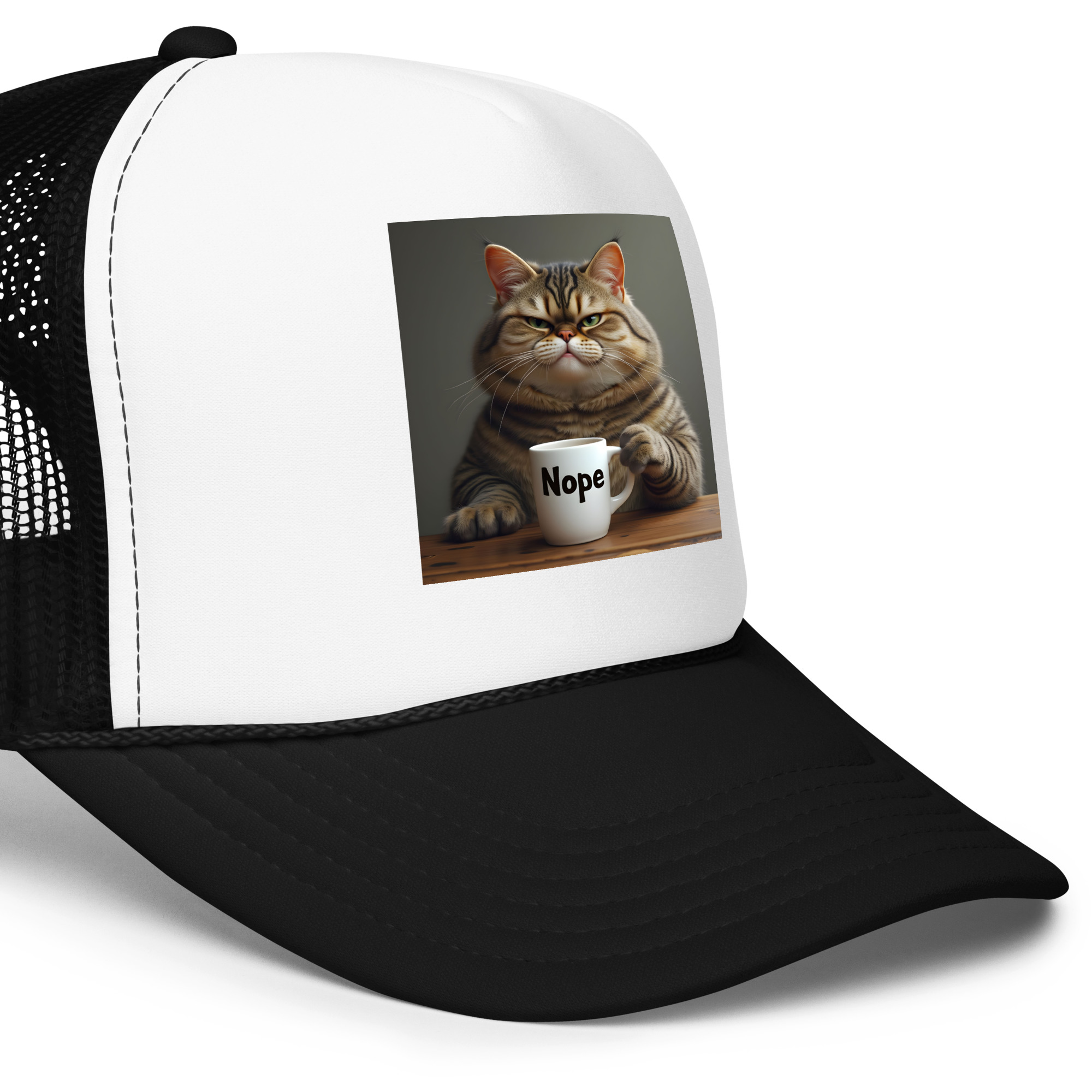 Channel the energy of this gloriously grumpy cat every time you step outside. Featuring a hyper-realistic, unimpressed feline clutching a “Nope” mug like it’s the last shred of patience they’ve got, this hat is peak mood and peak style. Built on a premium foam trucker base, it’s breathable, bold, and perfect for anyone who’d rather not today.