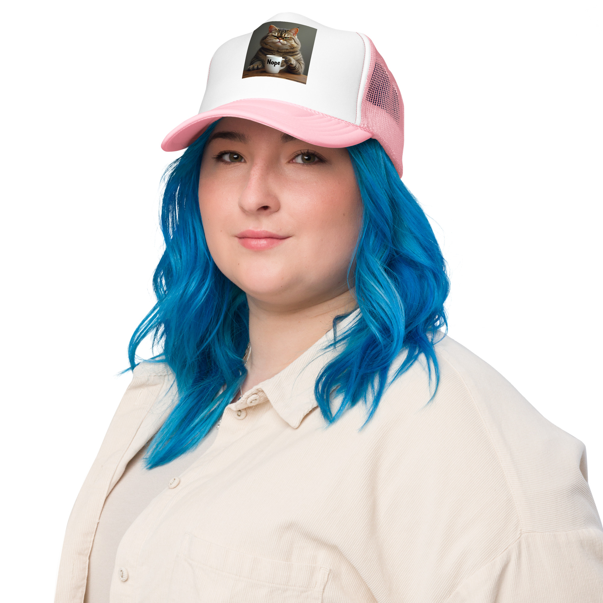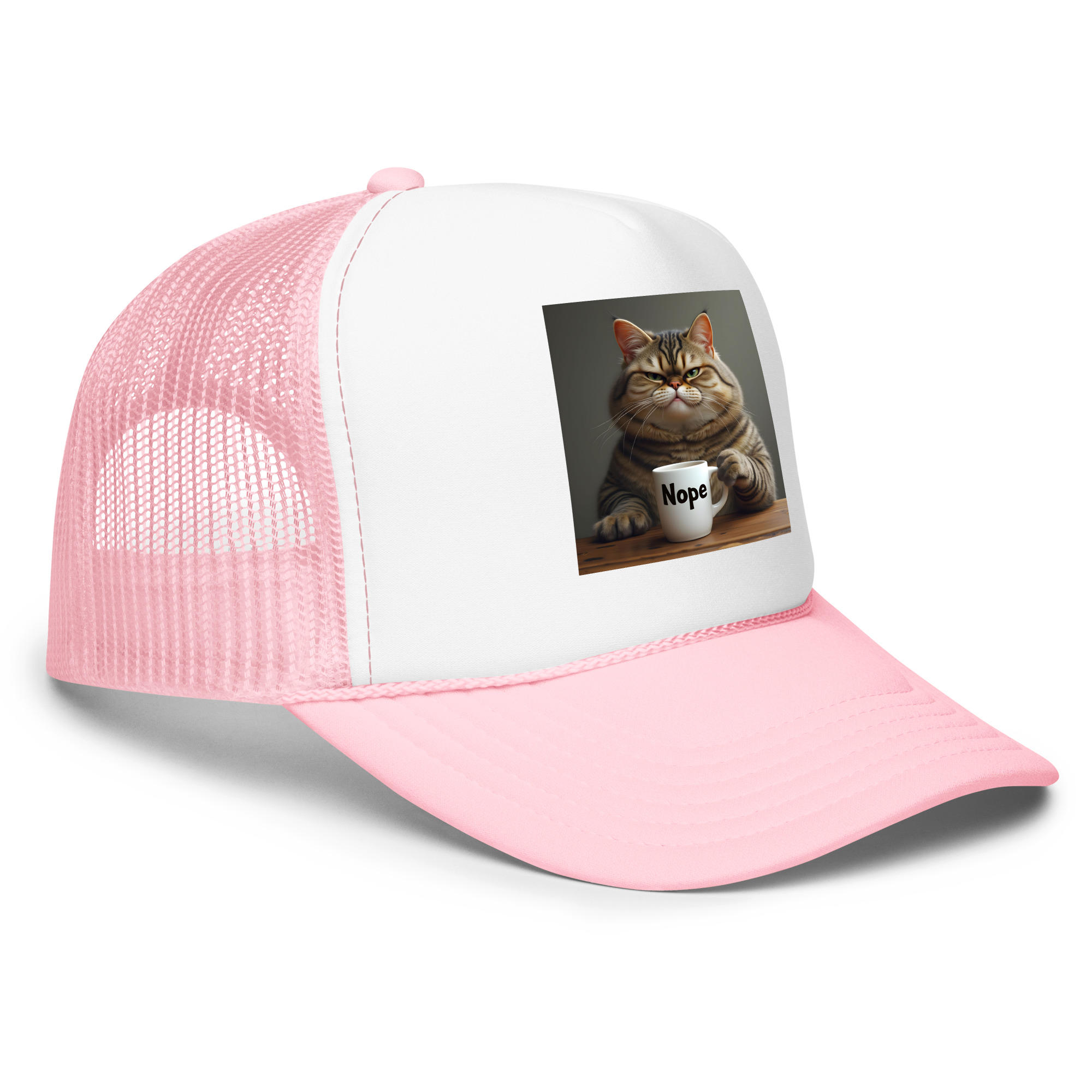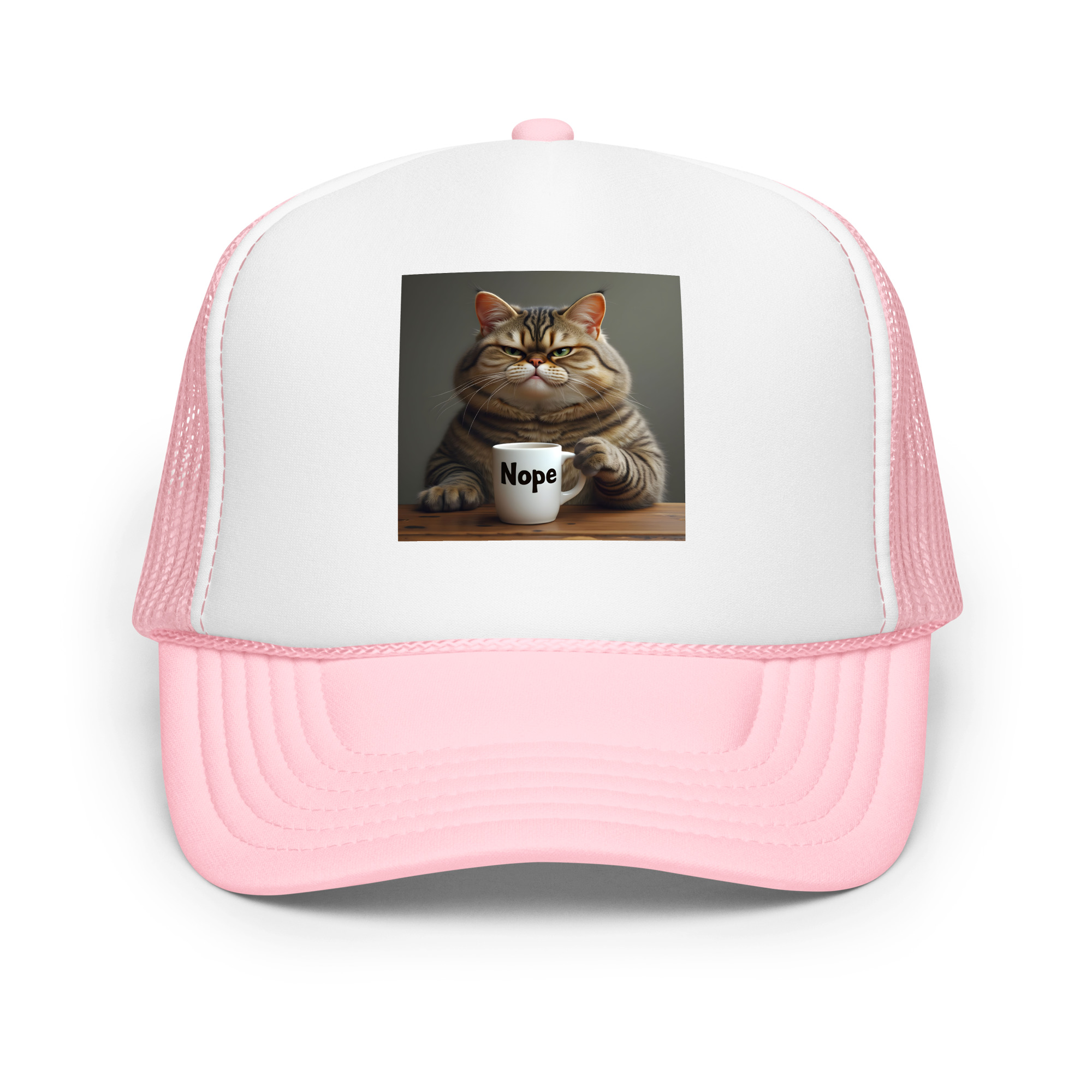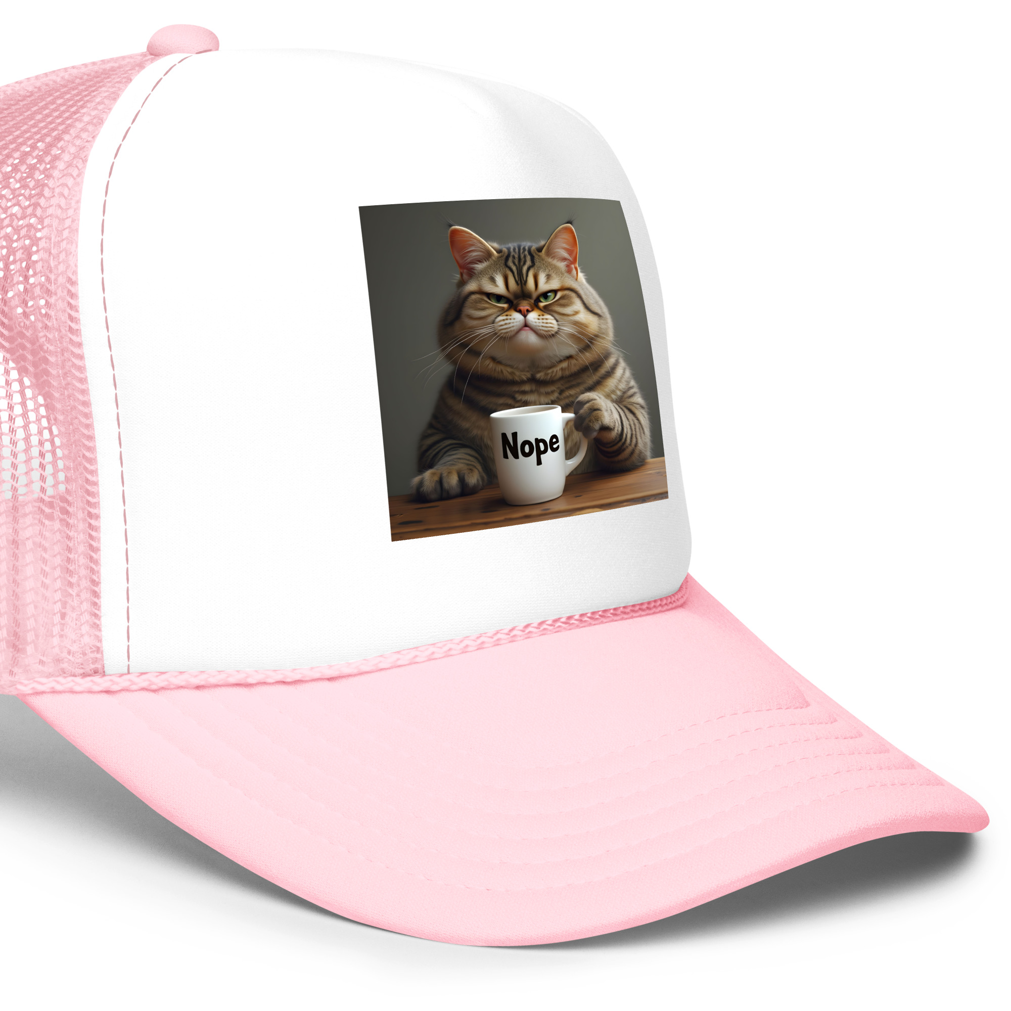 Channel the energy of this gloriously grumpy cat every time you step outside. Featuring a hyper-realistic, unimpressed feline clutching a “Nope” mug like it’s the last shred of patience they’ve got, this hat is peak mood and peak style. Built on a premium foam trucker base, it’s breathable, bold, and perfect for anyone who’d rather not today.
