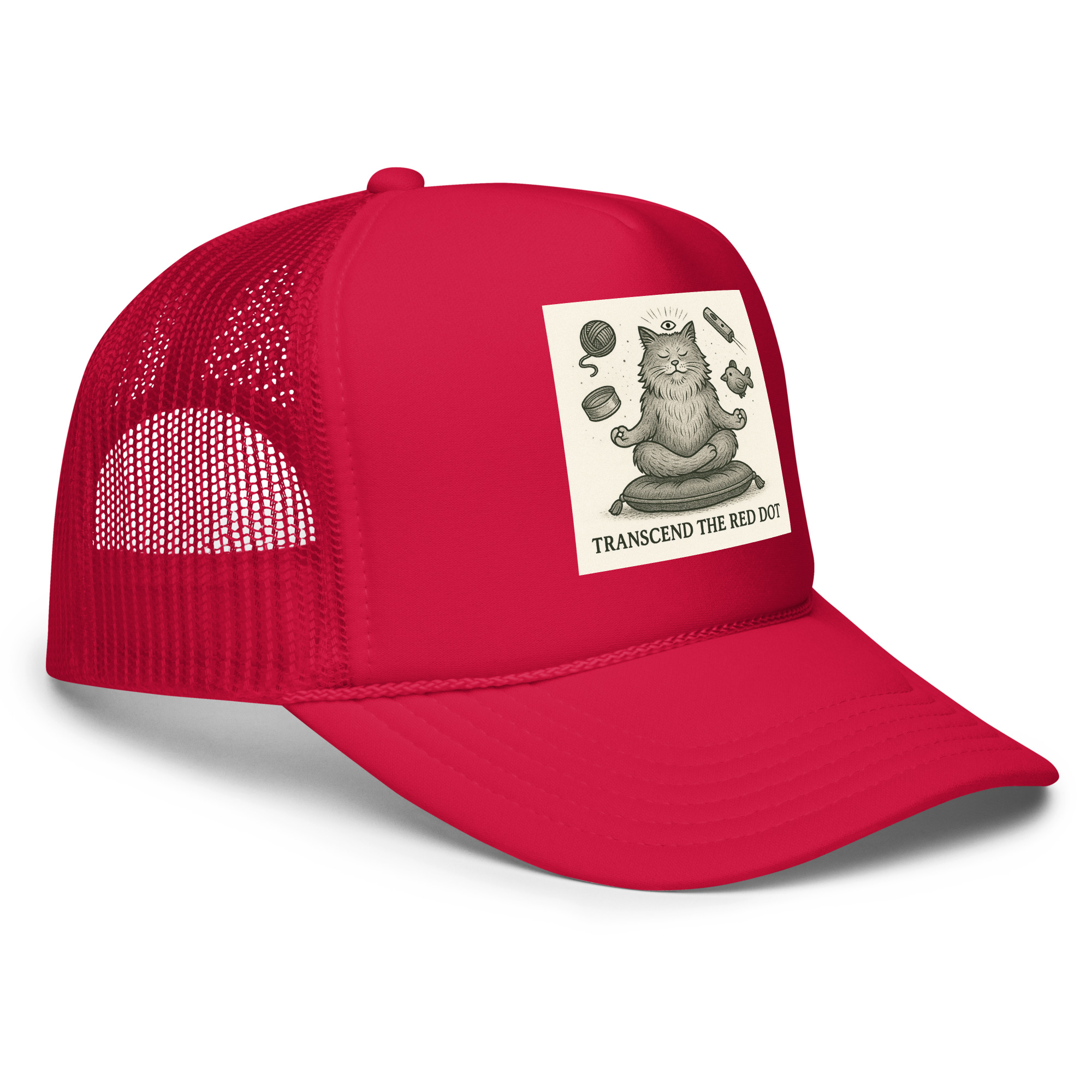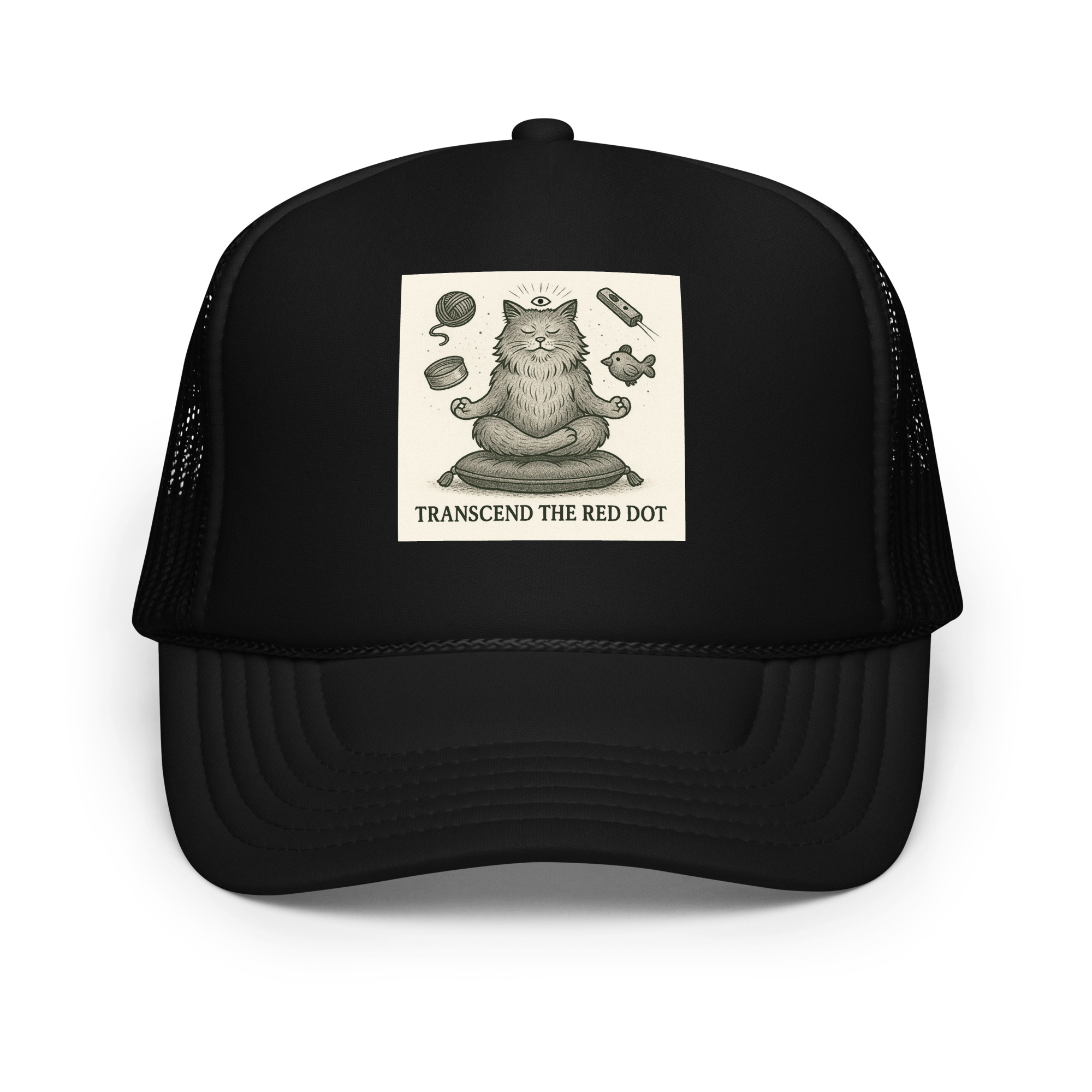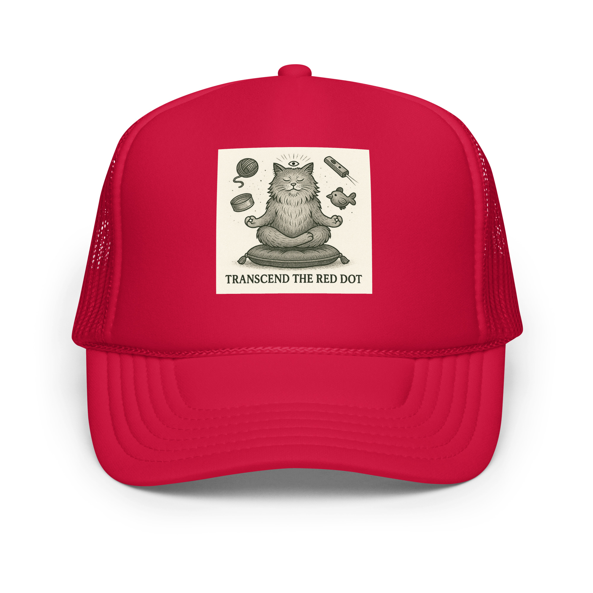 Achieve ultimate chill while making a statement with the Transcend the Red Dot foam trucker hat. Featuring our meditating cat graphic – complete with third eye and floating distractions – this cap is a wearable reminder to rise above the chaos (and the laser pointer).